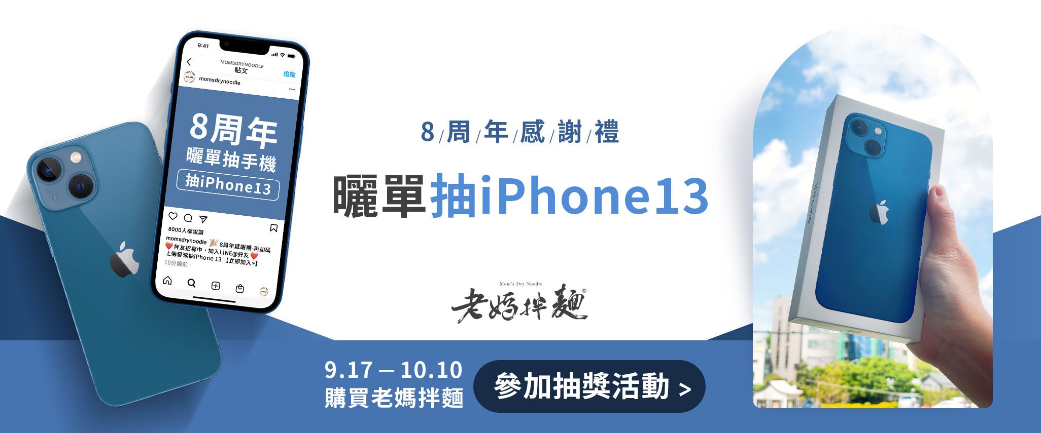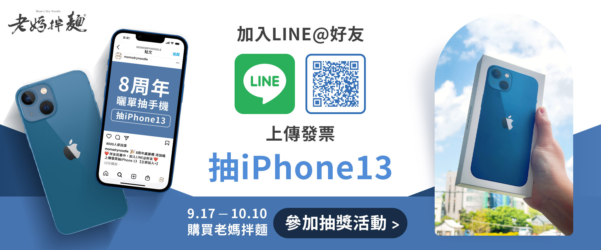 活動期間內,加入老媽官方LINE@,並於購買老媽拌麵任一商品,憑消費發票/訂單 截圖即可上傳發票登記抽「iPhone 13 128GB」(價值為25,900)