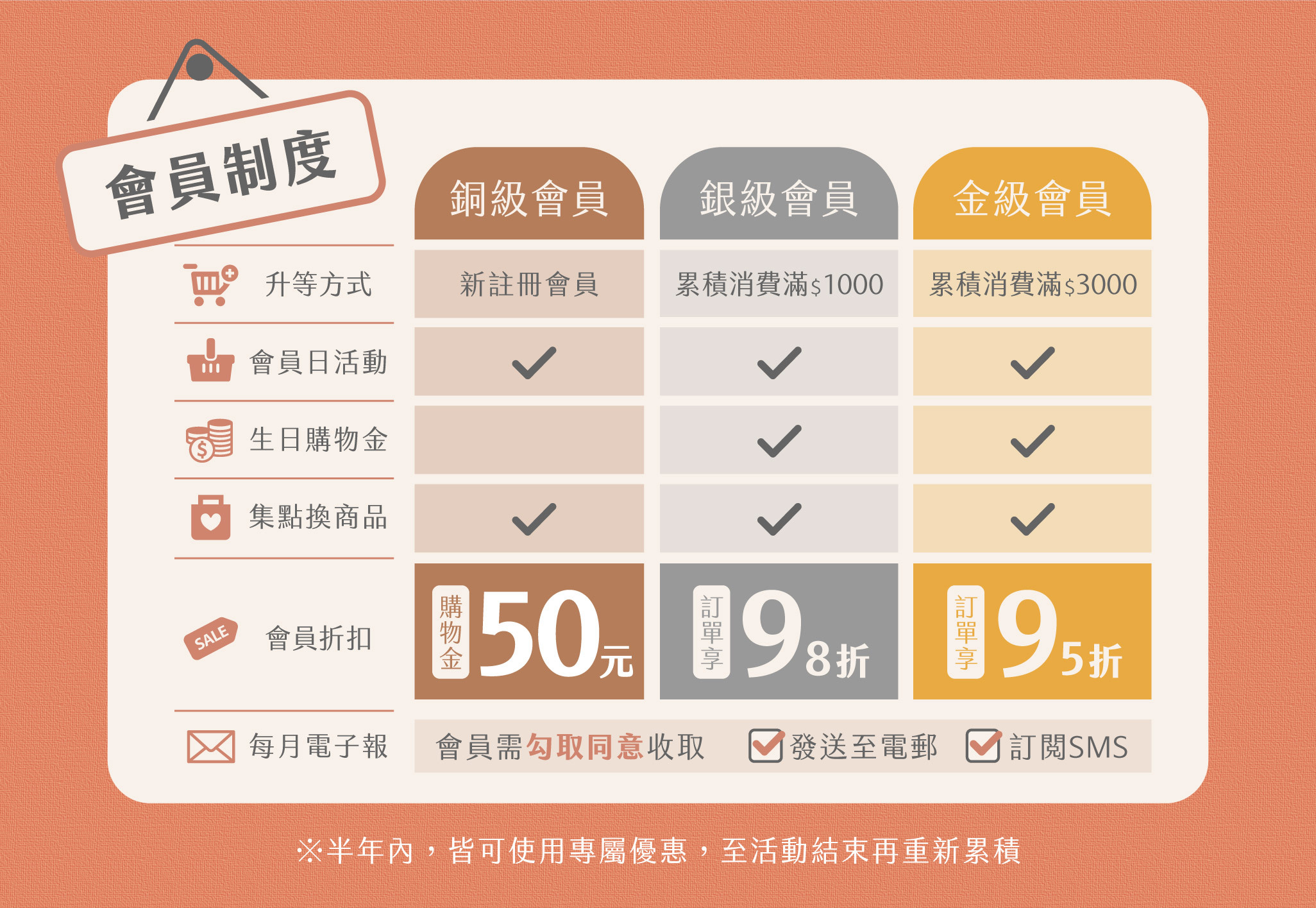 - 例如:消費滿 $500 最多可折抵 50 點購物金。