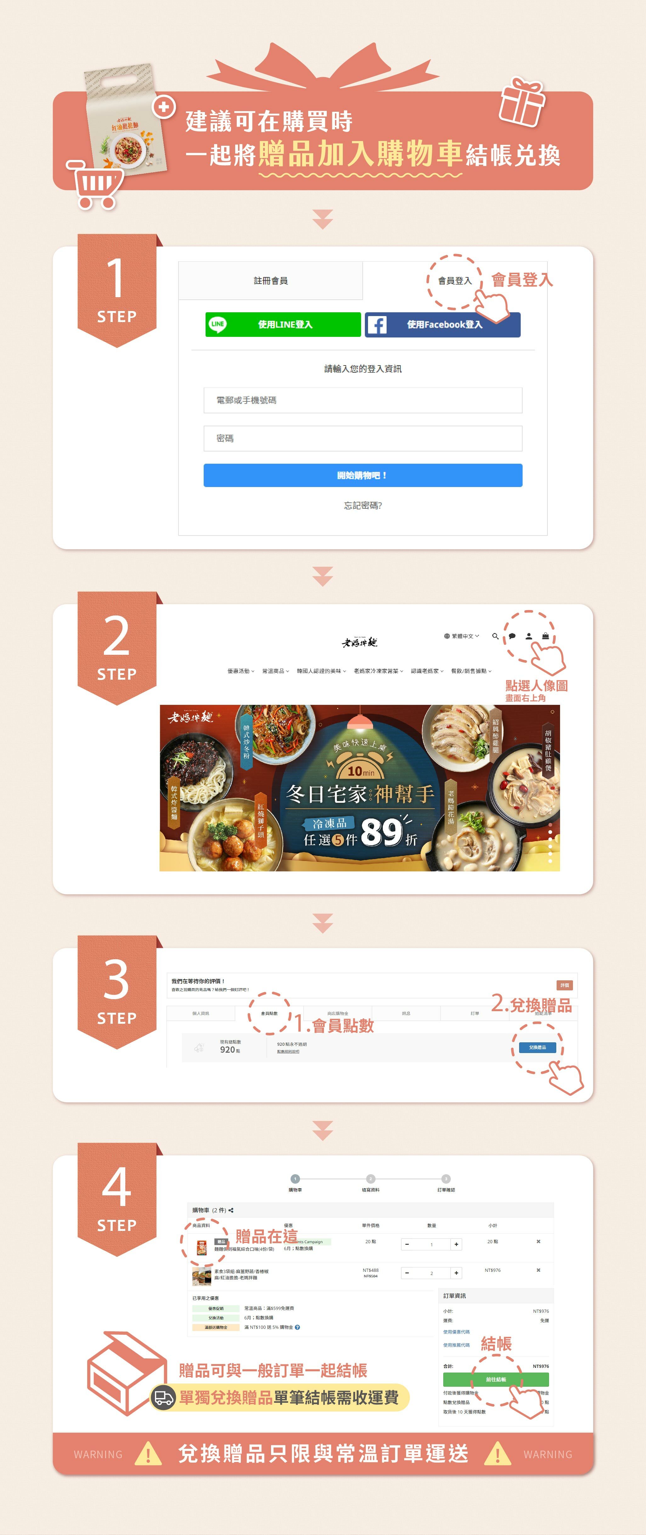 - 官網右上角點選【加入會員】➙【註冊會員】➙【使用 Line 或 FaceBook 加入】即完成會員資格。