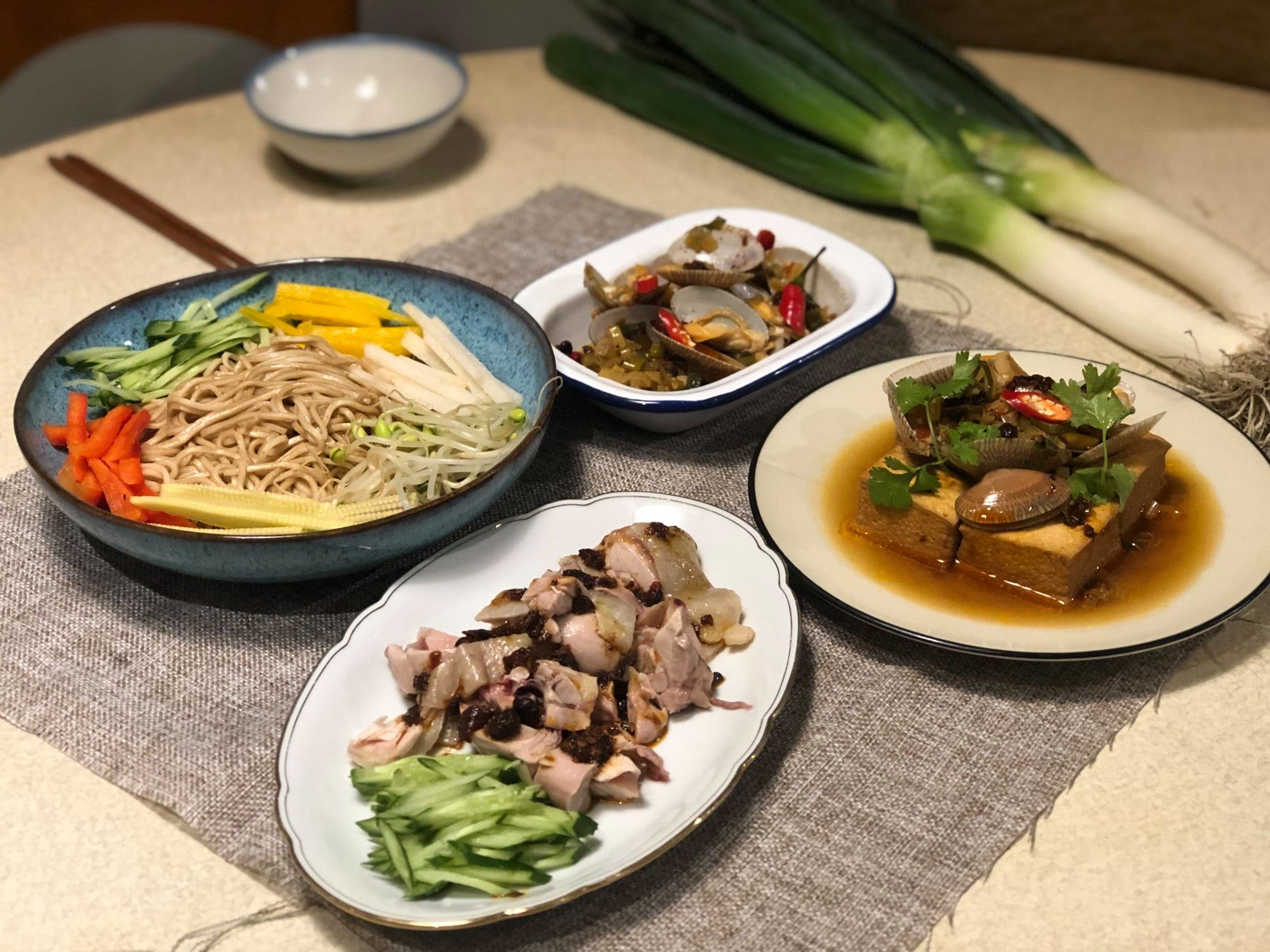 這次收到老媽拌麵的邀請,示範怎麼把看起來貪圖方便的常備食、麵、和香辣油,加點工後看起來有深夜食堂料理的氛圍,講究的是一個上班族下班後亂煮也不能棄守美味的精神。所以做了五彩的時蔬拌麵,還有辣韭蔥燉豆腐海瓜子,和一個偷懶版本的鹹水雞,與它的淋醬。