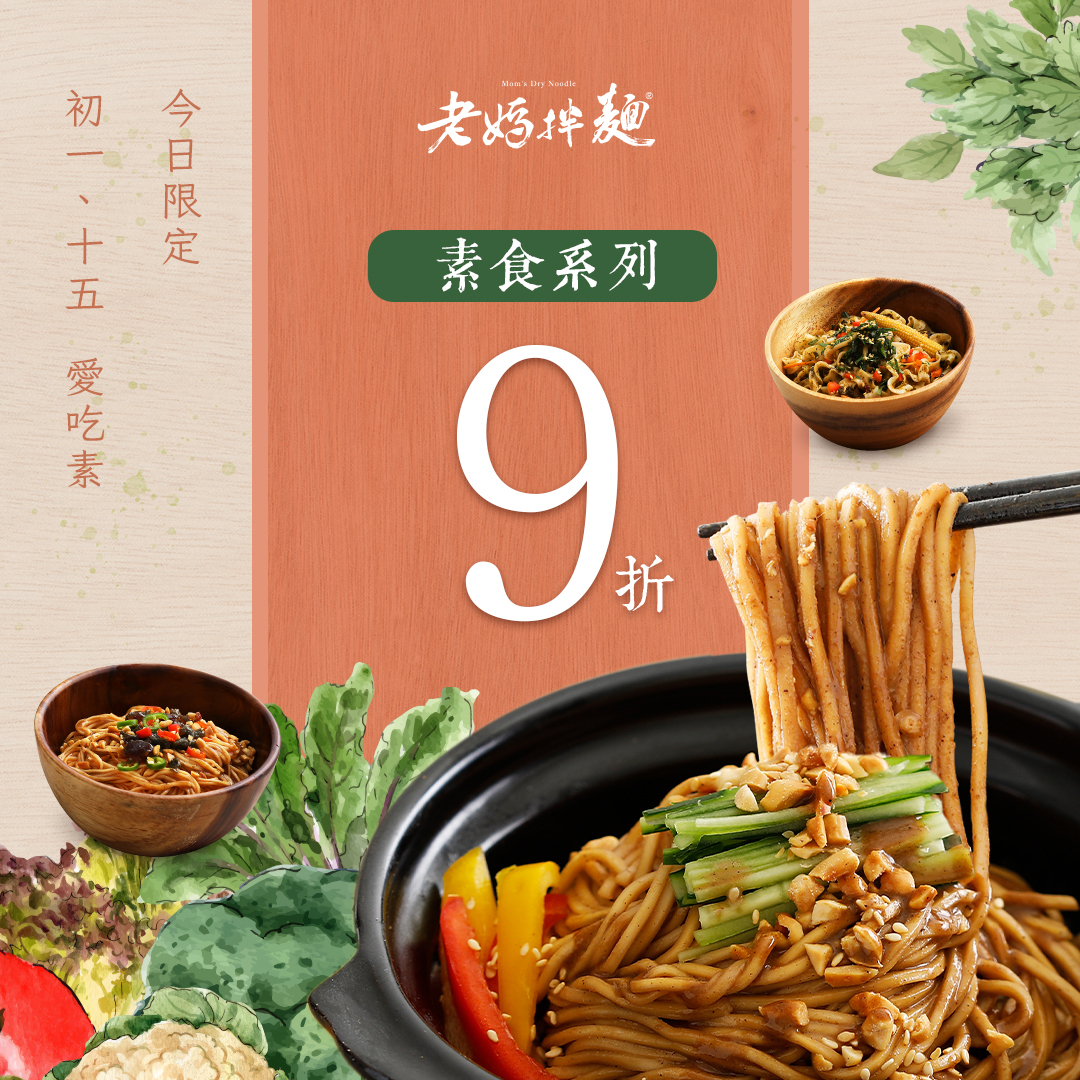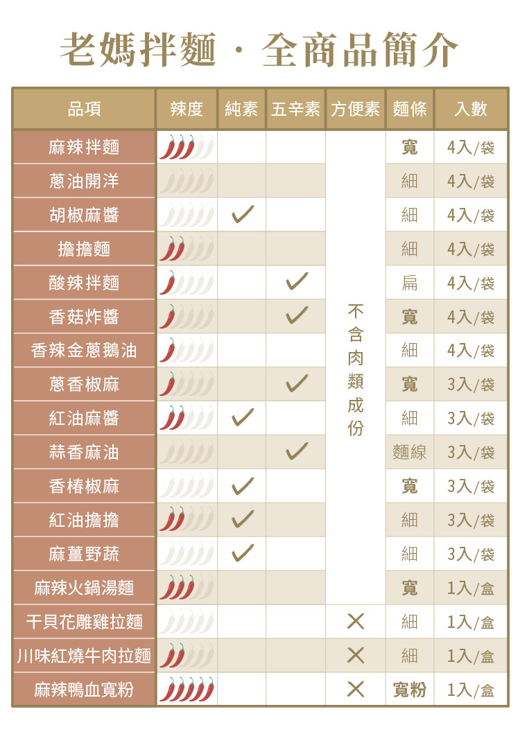 方便素:每款口味拌麵/麻辣火鍋湯麵 皆不含肉