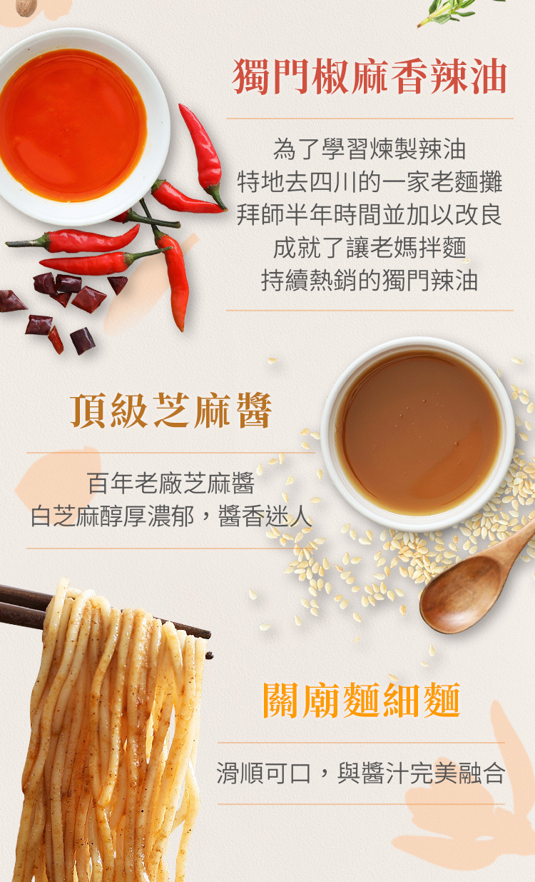 全素可食,自製老媽獨門香辣油,辣韻迷人,低溫烘焙研磨芝麻醬,口感細緻、醬香濃郁,特選關廟細麵滑順可口,與醬汁完美融合!